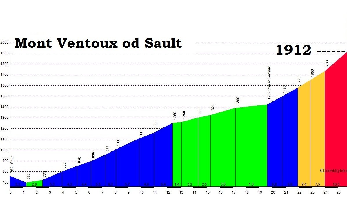 Mont Ventoux - nablížení busem do Sault na úpatí nejvyšší hory Provence - MONT VENTOUX 1909m a odtud je hned několik možností. Kaňonem Nesque zpět - ať už s výjezdem na vrchol či bez něj nebo zdolání vrcholu a nejkratší cestou zpět. 67-90-116km mapka nebo mapka